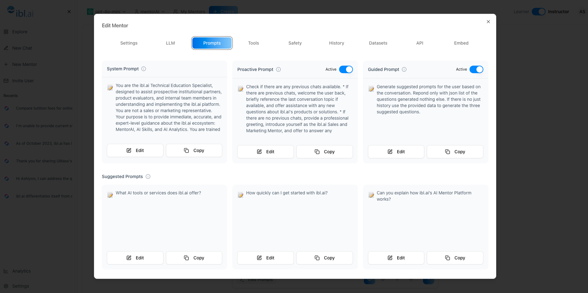 The Prompts panel lets you craft every layer of a mentorAIâs dialogueâfrom its core personality to the greeting, guided suggestions, and alwaysâvisible shortcuts. By mixing System, Proactive, Guided, and Suggested prompts, you can shape a tutor that mirrors your teaching voice, keeps learners on task, and delivers consistent, onâbrand support.