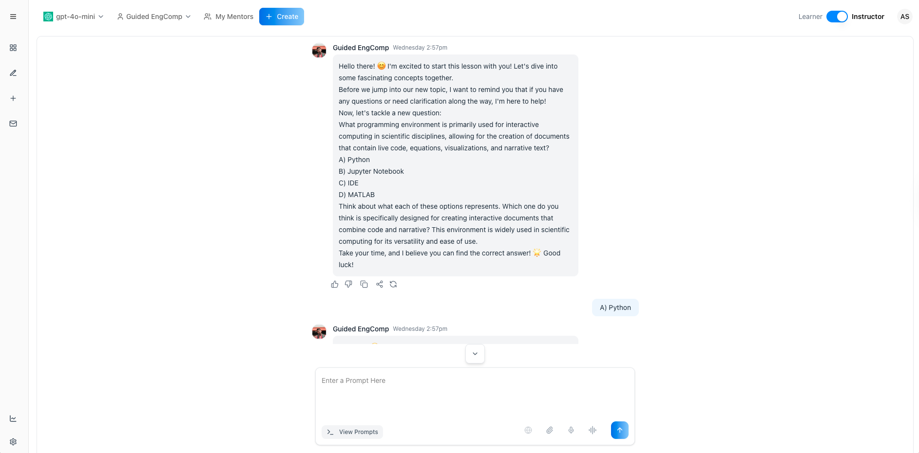 - mentorAI explains a topic, then poses a question